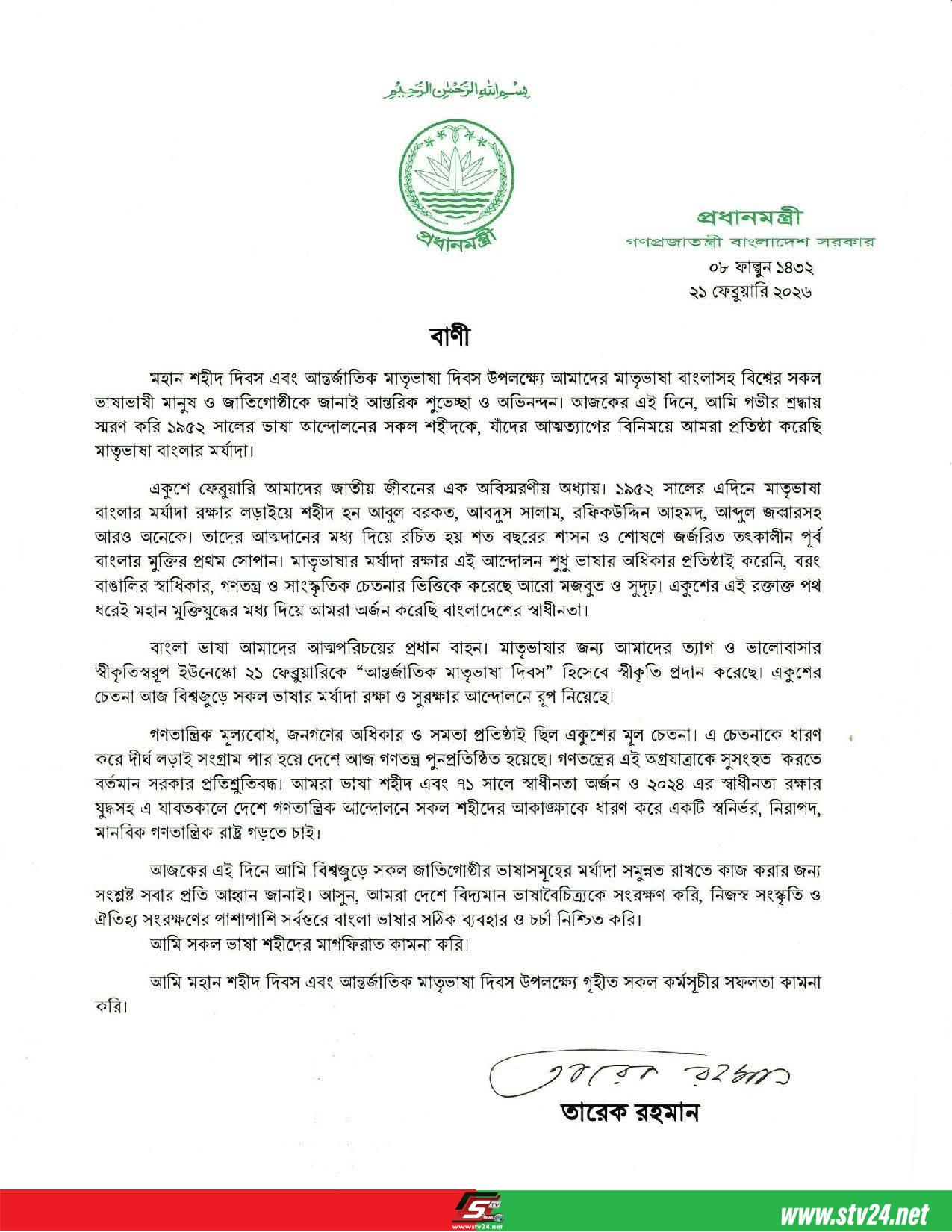 প্রধানমন্ত্রী তারেক রহমান ২৬ ফেব্রুয়ারি অমর একুশে বইমেলার উদ্বোধন ও একুশে পদক প্রদান করবেন। সকালে একুশে পদক প্রদান অনুষ্ঠান এবং